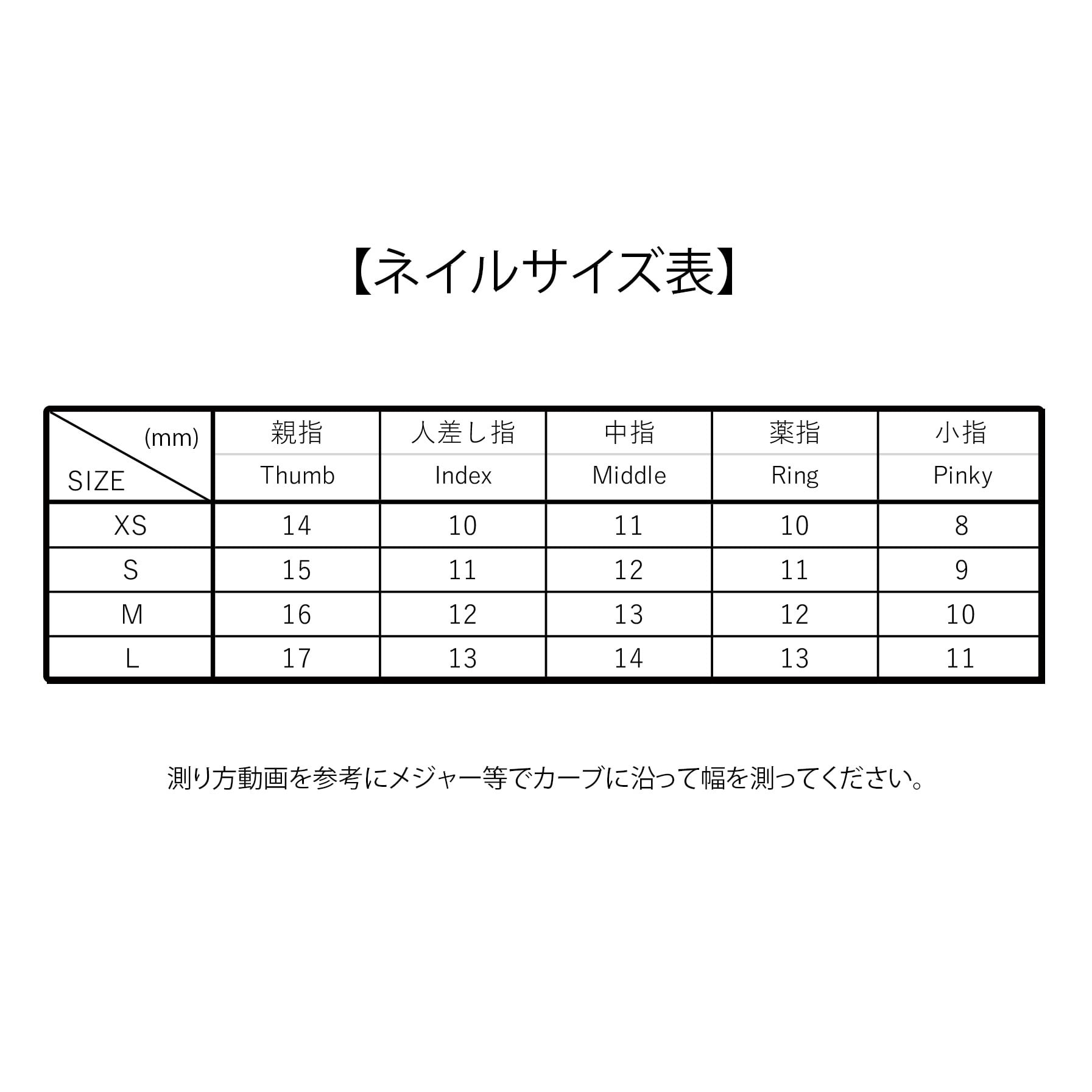 サイズの測り方動画を参考に測定して頂き、ネイルサイズ表と照らし合わせてお選びください。